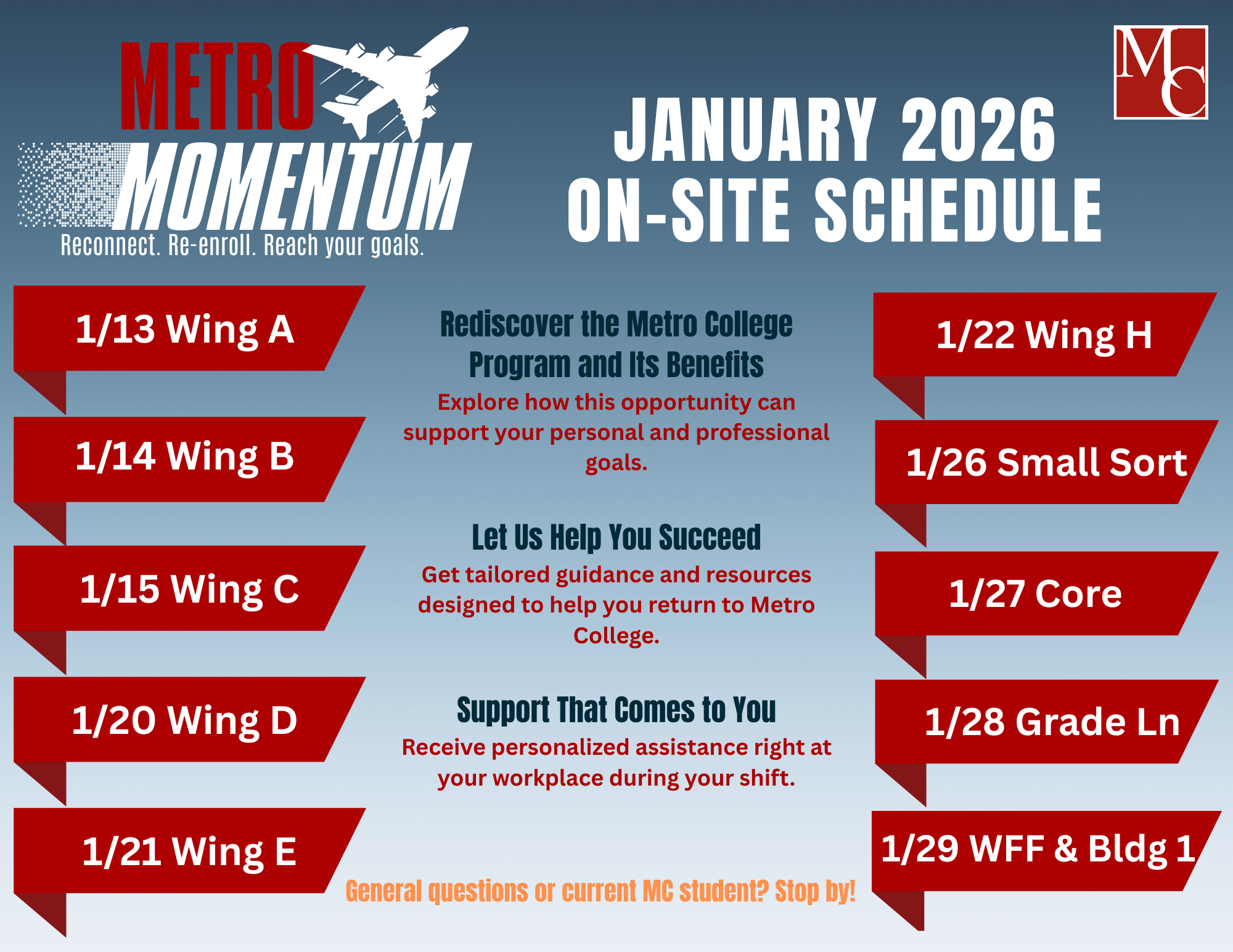 Metro College is coming to you this month! Stop by for more information about the MC program, tailored resources, and personalized assistance. Check out the flyer below to see when we'll be in your area.