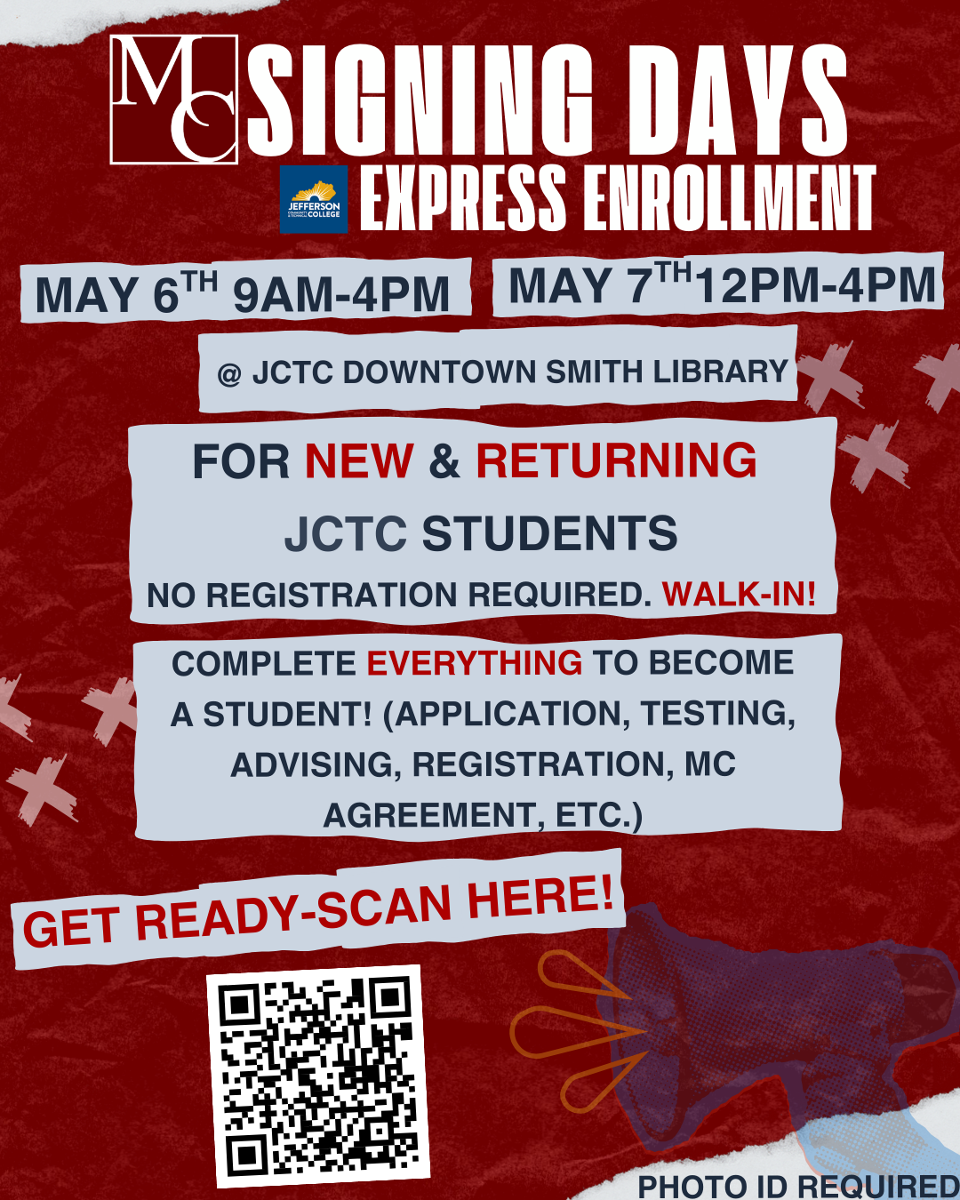 Walk-in event for new & returning students! Complete admissions, testing, advising, registration & sign your Metro College agreement. No registration needed—just bring a photo ID! Join us May 6 (9–4) or May 7 (12–4) at JCTC Downtown Smith Library.
