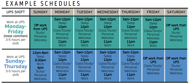 Sample schedules demonstrate typical weekly time commitments for students working at UPS.